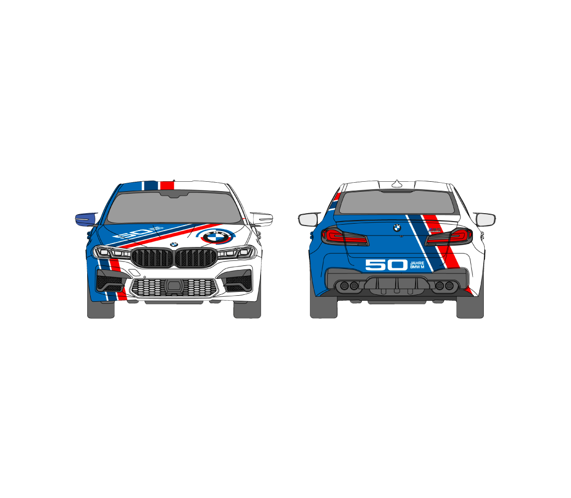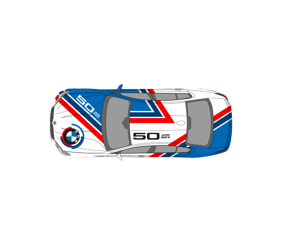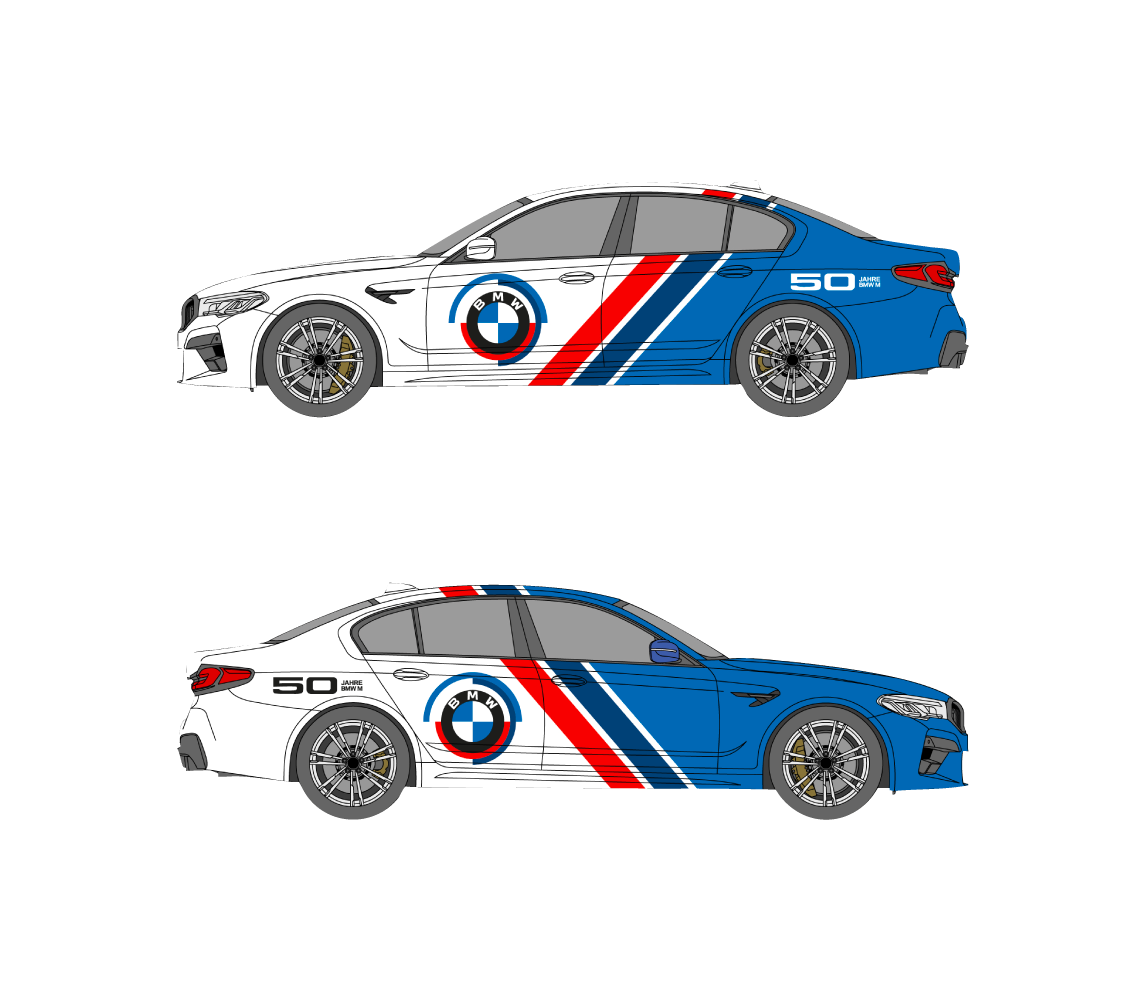The BMW 50th Anniversary mapping graphic design aims to showcase the legacy of the BMW brand and the spirit of motorsport to fans worldwide, while conveying the brand's uniqueness and pride through limited edition vehicles. Centered around the iconic colors of the BMW M series (blue, red, and white) and its logo, the design incorporates stripe patterns on key parts of the vehicle, such as the hood, sides, and rear. This harmoniously blends tradition with a modern aesthetic, emphasizing the racing spirit and dynamic energy.