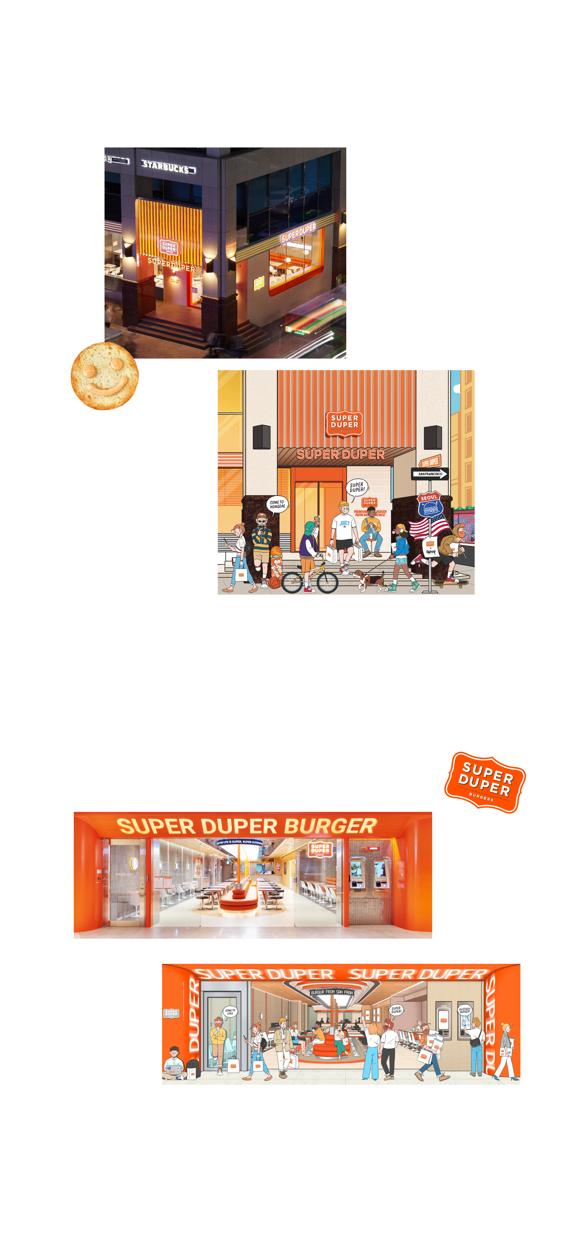'Super Duper' was launched in Korea in 2022 with a commitment to delivering high-quality burgers inspired by the values of slow food. We were responsible for the brand's visual communication, including print and social media, to support the opening of new stores that embody the core values of 'Super Duper.' For the opening of the Hongdae and COEX branches, we collaborated with the illustrator Quenzy, curating illustrations tailored to the project. Through various media, we showcased graphics that encapsulate Super Duper's unique brand identity, providing customers with a more enjoyable and distinctive brand experience.